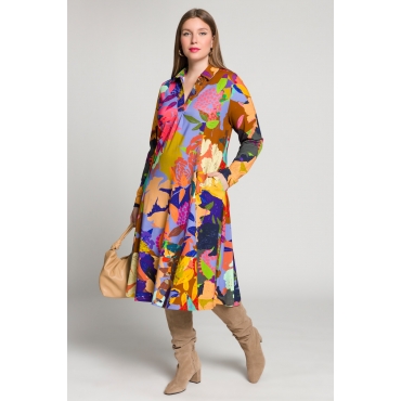 Midikleid aus hochwertigem Punto-di-Roma-Jersey mit farbigem Blätter-Design. Offener Hemdkragen mit Biese auf der V-Ausschnitt-Blende und Zierfalte. Wiener Nähte, weiter Rock mit Godetfalten. Seitliche Nahttaschen, Langarm. Bei Punto-di-Roma-Jersey handelt es sich um eine besonders dichte und hochwertige Stoffqualität aus zwei miteinander verbundenen Stofflagen mit zwei rechten Seiten. Er ist fester und etwas schwerer als herkömmlicher Single-Jersey, hat aber dennoch einen weichen Fall und einen hohen Tragekomfort. Premium-Mode für Dich! selection by Ulla Popken steht für Qualität und tragbare Eleganz. Klassiker verwandelt selection by Ulla Popken in moderne Highlights aus hochwertigen Materialien mit aufwendigen Drucken und Details – perfekt für jeden Tag und besondere Anlässe!