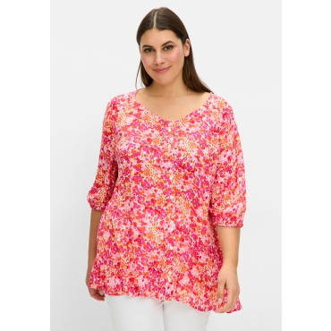 • Rundhalsausschnitt und Knopfleiste • 3/4-Ärmel mit schmalem Gummibündchen • Volant am Saum • Figurumspielende A-Linie • Leichte Crêpe-Qualität aus reiner Viskose Druckbluse mit floralem Dessin. Die Bluse ist mit weitem Rundhalsausschnitt und Knopfleiste gearbeitet, an den 3/4-Ärmeln befinden sich schmale Gummibündchen. Der ausgestellte Schnitt wird durch den Volant am Saum verspielt ergänzt. Besonders schmeichelnd präsentieren sich die gezielt gesetzten Teilungsnähte. Mehr zur Passform Durch die A-Linie umspielt der Schnitt locker die Figur und die A-Figur wird sanft betont. Mehr zum Material Die leichte Crêpe-Qualität besteht aus reiner, weich fließender Viskose.