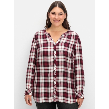 • Im Karo-Dessin • Lange Ärmel, mit Riegel und Knopf krempelbar • Rundhalsausschnitt mit V-Schlitz und Knopfleiste • Leicht taillierte Form mit leicht gerundetem Saum • Weich fließende Qualität aus reiner Viskose Bluse mit Karomuster. Das großformatige Muster und die kragenlose Form lassen sie lässig und sportiv wirken. Der Rundhalsausschnitt geht in V-Schlitz und Knopfleiste über, die mit Manschetten gearbeiteten Ärmel lassen sich locker auf 3/4-Länge krempeln und mit Knopf und Riegel befestigen. Der leicht gerundete Saum mit seitlichen Schlitzen verleiht der Bluse einen legeren Fall, feminines Detail ist die vorverlegte, gekräuselte Schulternaht. Mehr zur Passform Die Bluse ist leicht tailliert geschnitten und betont so die feminine X-Silhouette, der V-Schlitz streckt optisch den Oberkörper. Mehr zum Material Die Qualität aus reiner Viskose besitzt einen fließenden Fall und liegt angenehm weich auf der Haut.