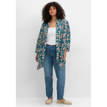 • Doppelt gearbeiteter Schalkragen • Überschnittene Schultern, angesetzte 3/4-Ärmel • Saum mit seitlichen Zipfeln, hinten leicht gerundet • Weite Form mit streckenden Teilungsnähten • Weich fließende Viskose aus LENZING™ ECOVERO™ Longbluse im Kimono-Stil von sheego by Joe Browns. Der verschlusslose Schnitt zeigt sich mit langem, doppelt gearbeitetem Schalkragen sowie weiten, überschnittenen 3/4-Ärmeln. Durch die seitlichen Zipfel und den hinten abgerundeten Saum fällt die Jacke locker über die Silhouette. Der farbenfrohe Blumendruck macht die Jacke zum modisch-femininen Blickfang. Mehr zur Passform Die weite, figurumspielende Passform fällt schmeichelnd über die Silhouette. Mehr zum Material Die hautfreundliche Qualität aus reiner LENZING™ ECOVERO™ Viskose fällt weich fließend.