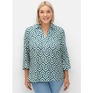 • Hemdblusenkragen mit V-Ausschnitt • 3/4-Arm, Passe hinten mit Quetschfalte • Seitenschlitze mit kontrastfarbenem Tape • Verlängerte Rückenpartie • Weich fließende Qualität aus reiner Viskose Tunika mit grafischem Alloverprint. Hemdblusenkragen, V-Ausschnitt und 3/4-Arm verleihen dem Oberteil einen gepflegten, klassischen Look. Die Rückenpartie ist länger geschnitten, die Quetschfalte sorgt für einen schönen Fall. Dekoratives Detail ist das kontrastfarbene Detail an den Seitenschlitzen im Saum. Mehr zur Passform Im figurumspielenden, geraden Schnitt mit verlängerter Rückenpartie. Mehr zum Material Die Qualität aus reiner Viskose fällt weich fließend.