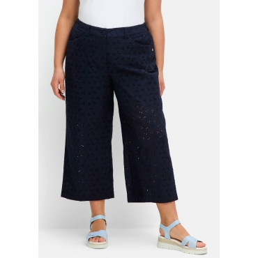 • Mit Lochstickerei, ab Knie leicht transparent • Teilgummibund hinten, Gürtelschlaufen, Taschen • Weite Culotte-Form in knöchelfreier Länge • Aus reiner Baumwolle • Unterstützt „Cotton made in Africa“ Culotte mit Allover-Lochstickereien. Das verspielte Muster verleiht der Hose einen sommerlich-luftigen Look, ein Futter macht sie bis zum Knie blickdicht. Sehr modern wirkt der weite, verkürzte Schnitt mit High-Waist-Bund, im Rücken ist für den optimalen Sitz ein bequemer Gummizug eingearbeitet. Dazu kommen Gürtelschlaufen, seitliche Eingrifftaschen sowie aufgesetzte Taschen hinten. Mehr zur Passform Das weite, verkürzte Bein sorgt für die typische Culotte-Form. Der hohe Bund sitzt bequem und unterstreicht den modischen Auftritt. Saumweite ca. 62 cm. Mehr zum Material Die Qualität aus reiner Baumwolle trägt sich auch an warmen Tagen sehr angenehm. Die Hose ist bis Mitte Oberschenkel gefüttert, ab Knie ist sie durch die Lochstickerei leicht transparent.