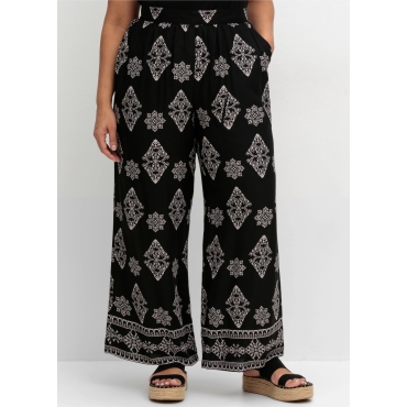 • Mix aus Ornament- und Bordürenprint • High-Waist-Bund vorn glatt, hinten gestretcht • Bequeme Schlupfform mit Seitentaschen • Weiter Schnitt mit langer, gerader Beinform • Beinhaltet LENZING™ ECOVERO™ Viskose Sommerhose von sheego by Joe Browns – ein stilvolles Highlight für warme Tage. Sie besticht mit einem charmanten Mix aus Ornament- und Bordürendruck am Hosensaum. Figurschmeichelnd wirkt der hohe Bund in Kombination mit einem glatten Formbund vorn und mit einem elastischen, gekräuselten Bund im Rücken, was für einen perfekten und bequemen Sitz sorgt. Ein praktisches Detail sind die schrägen Eingrifftaschen. Die weite Form mit langer, gerader Beinform bietet Bewegungsfreiheit und eine lässige Eleganz. Mehr zur Passform Der hohe Taillenbund streckt optisch die Figur und passt sich komfortabel an, die weite, lange Beinform umspielt luftig die Beine. Mehr zum Material Aus weich fließender Viskose-Qualität gefertigt, verspricht die Sommerhose ein leichtes und angenehmes Tragegefühl, ideal für den entspannten Sommer-Look.