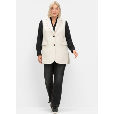 • Reverskragen und zwei Knöpfe • Zwei Pattentaschen, figurschmeichelnde Nähte • Vorn leicht gerundeter Saum, hohe Seitenschlitze • Längere, gerade Form • Kuscheliges Material mit Wollanteil, gefüttert Weste mit Wollanteil. Mit streckendem Reverskragen, 2-Knopf-Verschluss und Pattentaschen zeigt sie sich in klassischer Anzugwesten-Optik. Für ein modernes, entspanntes Upgrade sorgen die längere Passform, die hohen seitlichen Schlitze sowie der vorn leicht gerundete Saum. Mehr zur Passform Die etwas längere Form fällt locker bis über den Po. Hinten ist die Weste gerade geschnitten, vorn ist der Saum leicht gerundet. Mehr zum Material Der Wollanteil macht das Material schön kuschelig, auch das Futter sorgt für Tragekomfort.