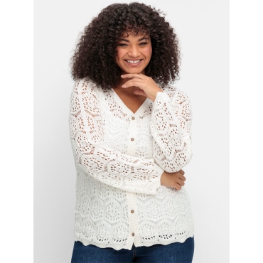 - V-Ausschnitt mit Bindeband - Femininer Kragen in Volantform - Gerundeter Saumabschluss mit Rippbündchen - Kurze, hüftumspielende Passform - Flauschig weiche Strickqualität Diese langärmlige Strickjacke von sheego by Joe Browns überzeugt durch ihr ansprechendes Rippstrickmuster. Besonders dekorativ zeigt sich der feminine Kragen in Volantform. Am V-Ausschnitt befindet sich außerdem ein dekoratives Bindeband. Der gerundete Saumabschluss endet mit Rippbündchen. **Mehr zur Passform** Die kurze, hüftumspielende Passform umschmeichelt gekonnt die Figur. **Mehr zum Material** Das weiche Strickmaterial ist angenehm flauschig.