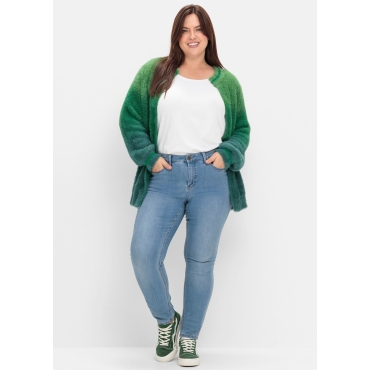• Colorierter Farbverlauf • Haken- und Ösen-Verschluss am Ausschnitt • Rippstrickbündchen an allen Abschlüssen • Mit Glanzgarn an Ärmelbündchen und Ausschnitt • Effektvolles, weiches Flauschgarn Strickjacke von sheego by Joe Browns. Das herrlich flauschige Garn wirkt durch den sanften Farbverlauf besonders effektvoll. Einen hübschen Kontrast setzt dazu das eingestrickte Glanzgarn an Ärmelbündchen und Rundhalsausschnitt. Geschlossen wird die Strickjacke mit Haken und Öse am Ausschnitt, nach unten hin bleibt sie offen. Mehr zur Passform Der gerade Schnitt fällt locker über die Silhouette. Mehr zum Material Das flauschige Strickgarn fühlt sich superweich an und hält angenehm warm.