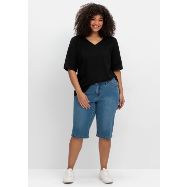 • Bei schmaler Taille, kräftigem Po und Oberschenkeln • Formbund mit V-förmigen Gürtelschlaufen hinten • Schmale Beinform in Bermudas-Länge • Denim-Qualität aus Baumwolle, mit Stretchanteil • Unterstützt „Cotton made in Africa“ Schmale Jeans-Bermudas im Curvy-Schnitt VERENA. Der komfortable Fit ist perfekt auf die Figur mit schmaler Taille, viel Po und kräftigen Oberschenkeln zugeschnitten. Waschung und Kontrastnähte verleihen der kurzen Jeans eine legere Optik. Dazu kommen Eingrifftaschen vorn sowie aufgesetzte Taschen hinten. Der Formbund ist mit Gürtelschlaufen gearbeitet. Mehr zur Passform Die Passform VERENA ist schmal an der Taille und weit an Po und Oberschenkel geschnitten. Durch den hinten höheren Schnitt mit V-förmigen Gürtelschlaufen steht die Bermudas auch im Sitzen nicht ab, die Passe schmeichelt der Figur zusätzlich. Mehr zum Material Die elastische Denimqualität aus Baumwolle trägt sich sehr angenehm.