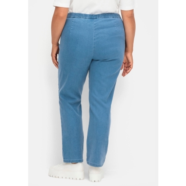 Wunderbar bequeme Jeans mit komfortablem Rundum-Dehnbund. Die Patte vorne mit 2 silberfarbigen Knöpfen und imitierter Reißverschluss-Blende liegt schön an. 2 Taschen vorne. Fußweite ca. 38 cm.