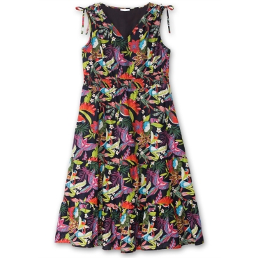 - Tiefer V-Ausschnitt, gesmokte Schulterpartie - Taillen-Smokbund, Taschen, Reißverschluss seitlich - Knöchellanger gefütterter Rock mit Volants am Saum - Aus reiner Baumwolle - Unterstützt „Cotton made in Africa“ Ärmelloses Maxikleid von sheego by Joe Browns. Der farbenfrohe Print wirkt herrlich sommerlich. Das Kleid besitzt einen tiefen V-Ausschnitt, die gesmokte Schulterpartie kann mit dem Bindeband individuell gerafft werden. Ein bequemer, leicht gekräuselter Smokbund betont die Taille, darunter schließt sich der weit schwingende Rock mit Volants am Saum an. Ein nahtfeiner seitlicher Reißverschluss und schräg eingesetzte nahtfeine Taschen ergänzen den Look. ****Mehr zur Passform**** Der Smokbund rückt die Körpermitte in den Fokus. Ab Taille fällt das Kleid weit schwingend und endet in knöchelumspielender Länge. So betont es perfekt die feminine Sanduhrsilhouette des X-Typs und gleicht – auch durch den streckenden Ausschnitt – die V-Figur harmonisch aus. ****Mehr zum Material**** Aus reiner, trageangenehmer Baumwolle. Für noch mehr Tragekomfort sorgt der komplett gefütterte Rock.
