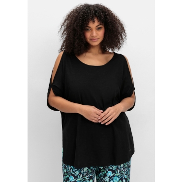 • Rundhals mit V-Schlitz und Bindeband hinten • Fledermausärmel mit Cut-out • Figurumspielender Schnitt mit Seitenschlitzen • Weiche Jerseyqualität aus Baumwoll-Viskose-Mix • Unterstützt „Cotton made in Africa“ Shirt mit femininen Details. Der Rundhalsausschnitt ist im Rücken geschlitzt und wird mit einem Bändchen geknotet, die kurzen Fledermausärmel mit stylischen Cut-outs lassen die Haut durchblitzen. Bequeme Seitenschlitze am geraden Saum sorgen für Tragekomfort. Mehr zur Passform Der figurumspielende Schnitt und die Fledermausärmel vereinen Komfort und modischen Stil. Die überschnittenen Schultern wirken nicht nur lässig, sie schmeicheln auch dem V-Typ mit etwas breiteren Schultern. Mehr zum Material Die weiche, atmungsaktive Jerseyqualität aus einem Baumwoll-Viskose-Gemisch sorgt für ein angenehmes Tragegefühl, auch an warmen Tagen.