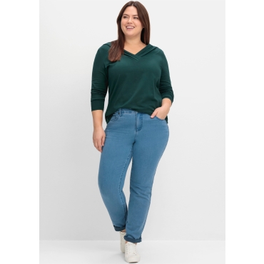 • Überlappender V-Ausschnitt • Blende mit Falten, in Double-Layer-Verarbeitung • Leicht ausgestellte Form, in Po-bedeckender Länge • Leicht elastischer Baumwolljersey • Unterstützt „Cotton made in Africa“ Langarmshirt mit streckendem V-Ausschnitt und überlappender Double-Layer-Verarbeitung von sheego by Joe Browns. Die breite Blende am Ausschnitt ist dekorativ in Falten gelegt und gibt so dem schlichten Look eine feminine Note. Ob als Solist oder als Ergänzung darunter – das Basic-Shirt ist ein perfekter Allrounder. Mehr zur Passform In figurumspielender Passform und Po-bedeckender Länge. Der leicht taillierte und leicht ausgestellte Schnitt unterstreicht die feminine Silhouette des X-Typs. Auch die O-Silhouette mit runder Körpermitte sowie die H-Figur mit einer geradlinigen Silhouette werden optisch ausgeglichen. Mehr zum Material Der leicht elastische Jersey aus Baumwolle liegt angenehm auf der Haut.