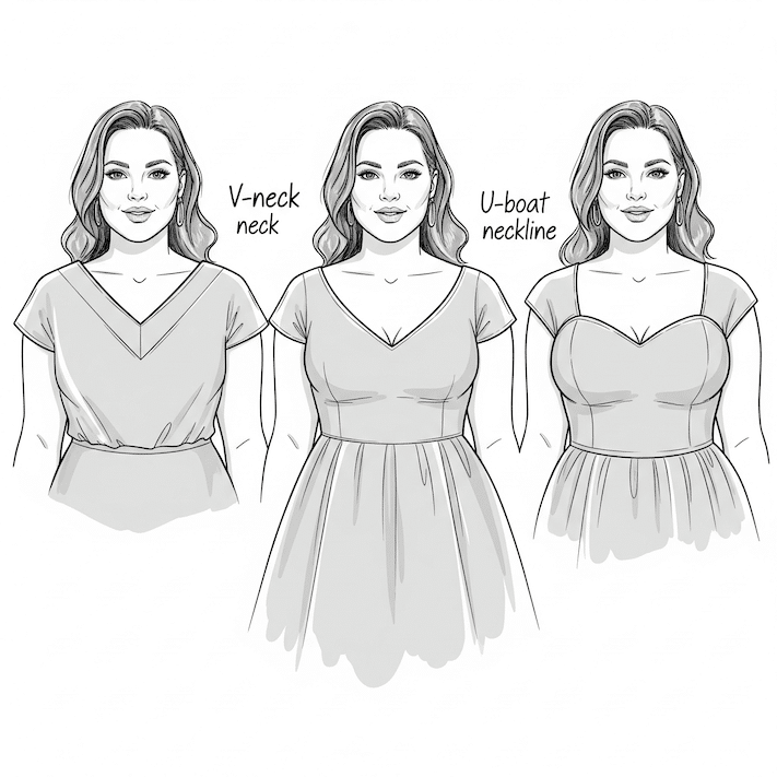 - V-Ausschnitt: Der V-Ausschnitt ist ein wahrer Alleskönner und ein absoluter Favorit für kurvige Frauen. Er verlängert den Hals optisch, schafft eine vertikale Linie am Oberkörper und lenkt den Blick nach oben, was eine insgesamt streckende Wirkung hat. Er ist sowohl elegant als auch feminin und schmeichelt nahezu jeder Brustgröße.