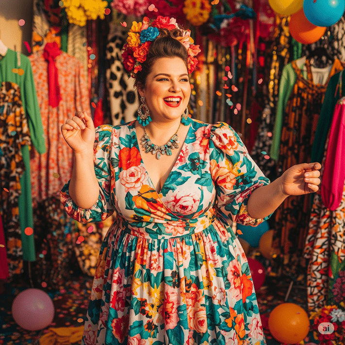 - Helle Farben und Prints: Trauen Sie sich unbedingt auch an hellere Farben und lebendige Muster! Wichtig ist hier die Passform und die Platzierung des Musters. Ein Kleid in einer hellen Farbe kann wunderschön aussehen, wenn der Schnitt stimmt. Wenn Sie einen Print tragen, achten Sie darauf, dass er nicht zu dominant ist. Ein cleverer Trick ist das sogenannte „Color Blocking“, bei dem dunklere Partien an den Seiten des Kleides eine schlankere Taille zaubern können.