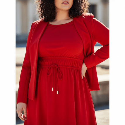 Eine Frau in einem komplett roten monochromen Kleidungsset, das eine durchgehende Linie bildet.