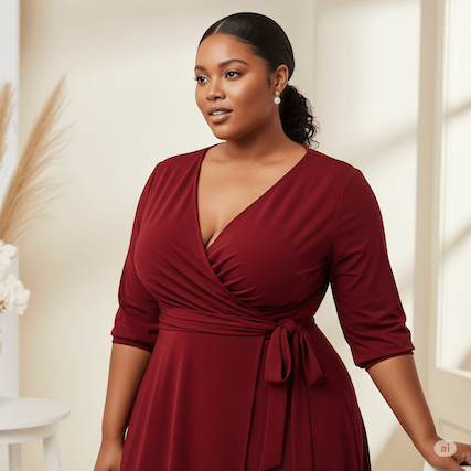 - Warum es funktioniert: Das Wickelkleid schafft durch seine V-Ausschnitt-Form eine vertikale Linie, die den Oberkörper streckt. Die Wickeltechnik betont die Taille und kaschiert gleichzeitig den Bauchbereich durch die Überlappung des Stoffes. Die diagonale Linie des Wickels lenkt das Auge und schafft eine schmeichelhafte Sanduhr-Silhouette.