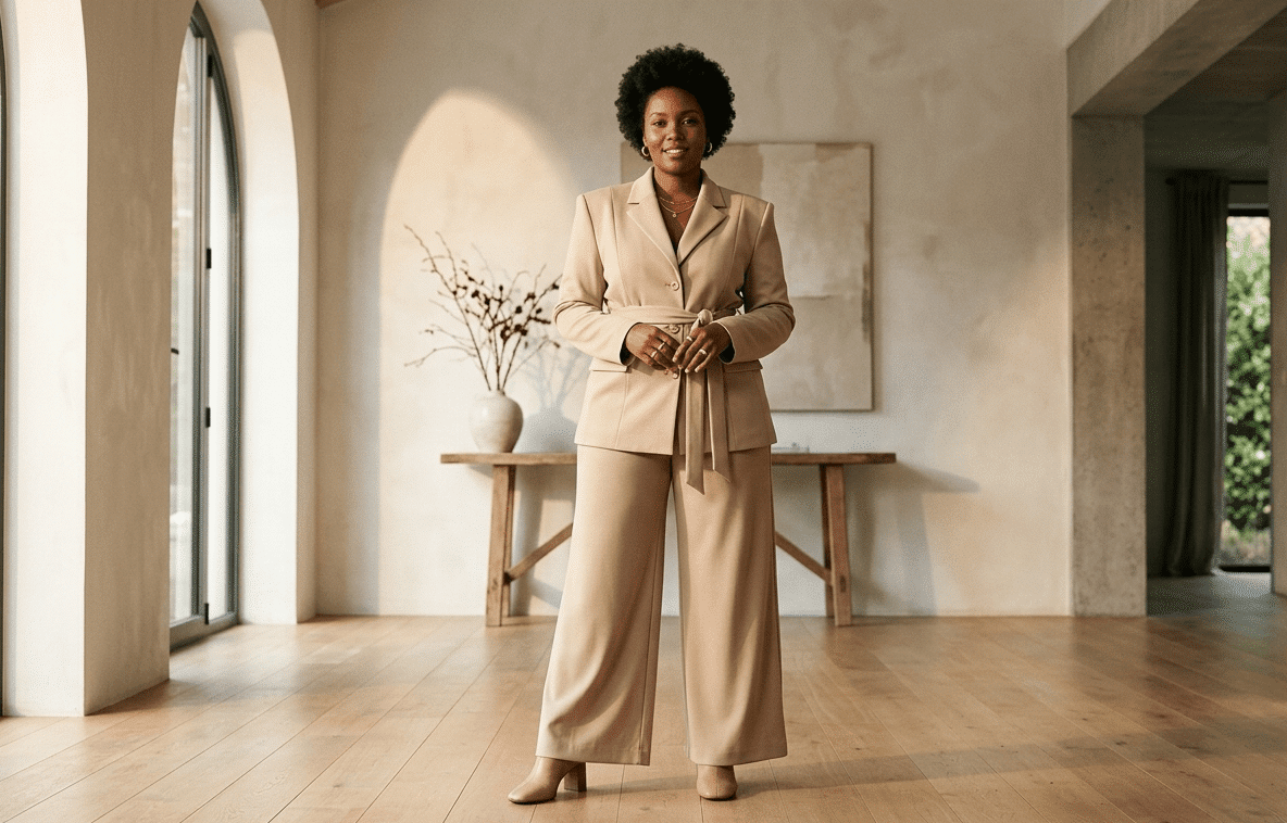 Curvy Mode Trends 2026 der Look: Ein fließender Hosenanzug mit einer weit geschnittenen Wide-Leg-Hose und einem Blazer mit betonten Schultern.