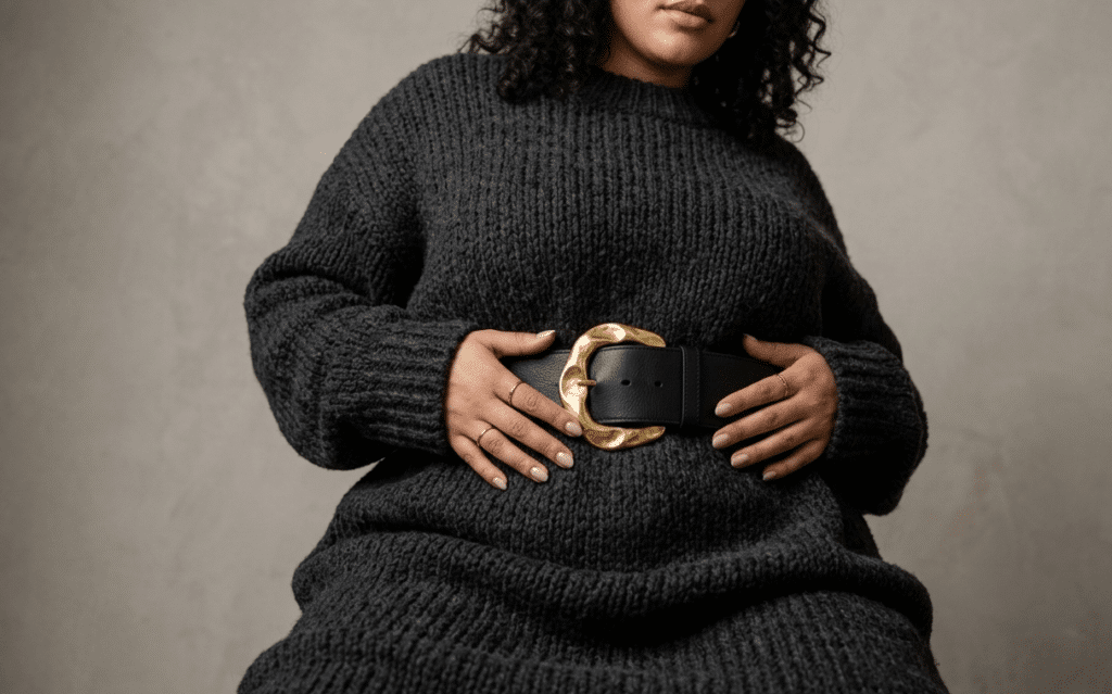 Pro-Tipp für Curvies: Setze den Gürtel etwas höher an (Empire-Linie), um die Beine optisch zu verlängern und die schmalste Stelle des Oberkörpers zu betonen.