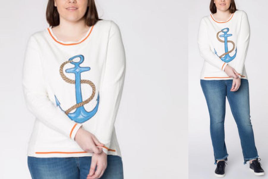 Das modische Sweatshirt von Marina Rinaldi Sport zeigt ganz deutlich deine Liebe zum Meer. Bestickt ist es mit einem großen Anker-Motiv auf der Vorderseite in harmonischen Farbtönen, wobei das Blau des Ankers den Style dominiert. Es ist auf einem weißen große Größen Sweatshirt aufgestickt, sodass es besonders gut zur Geltung kommt. Abgesetzt sind Kragen und Bund mit einem orangefarbenen Streifen, die das Motiv optisch umrahmen.