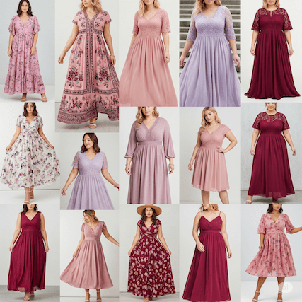 - A-Linien-Kleider: Kleider in A-Linie, die ab der Brust oder Taille ausgestellt sind, sind ebenfalls sehr vorteilhaft, da sie eine feminine Silhouette schaffen und Problemzonen kaschieren.